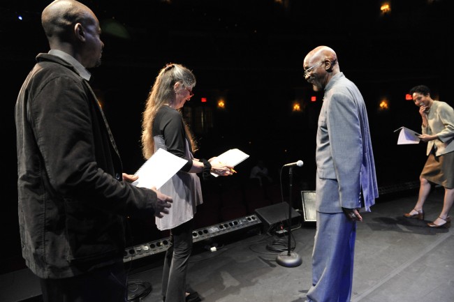 Readers portraying Russell Maroon Shoatz and his family talk over a scene with the director during rehearsal Add new comment