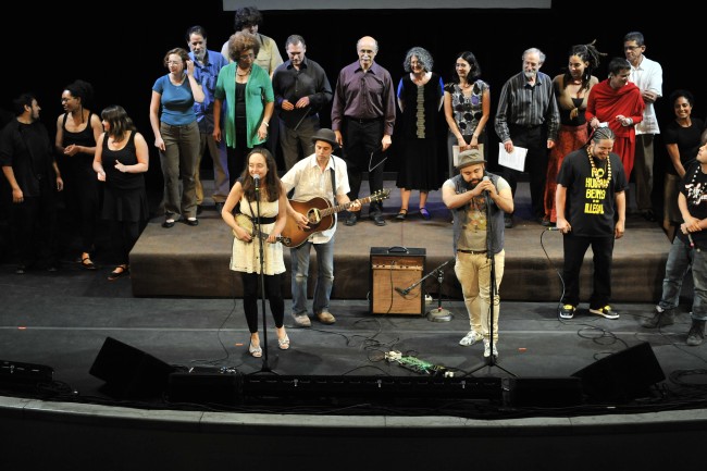 All cast joined together on stage for a finale of "Get Up, Stand Up"