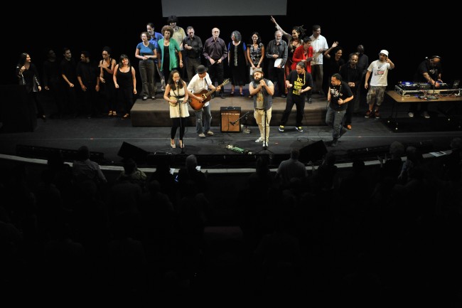 The bands sang "Get Up, Stand Up!" verses in Spanish and English