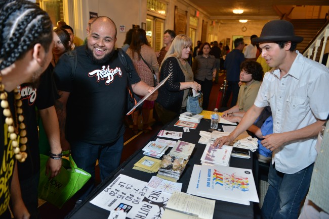 Rebel Diaz checking out Mike + Ruthy's merch table in the lobby